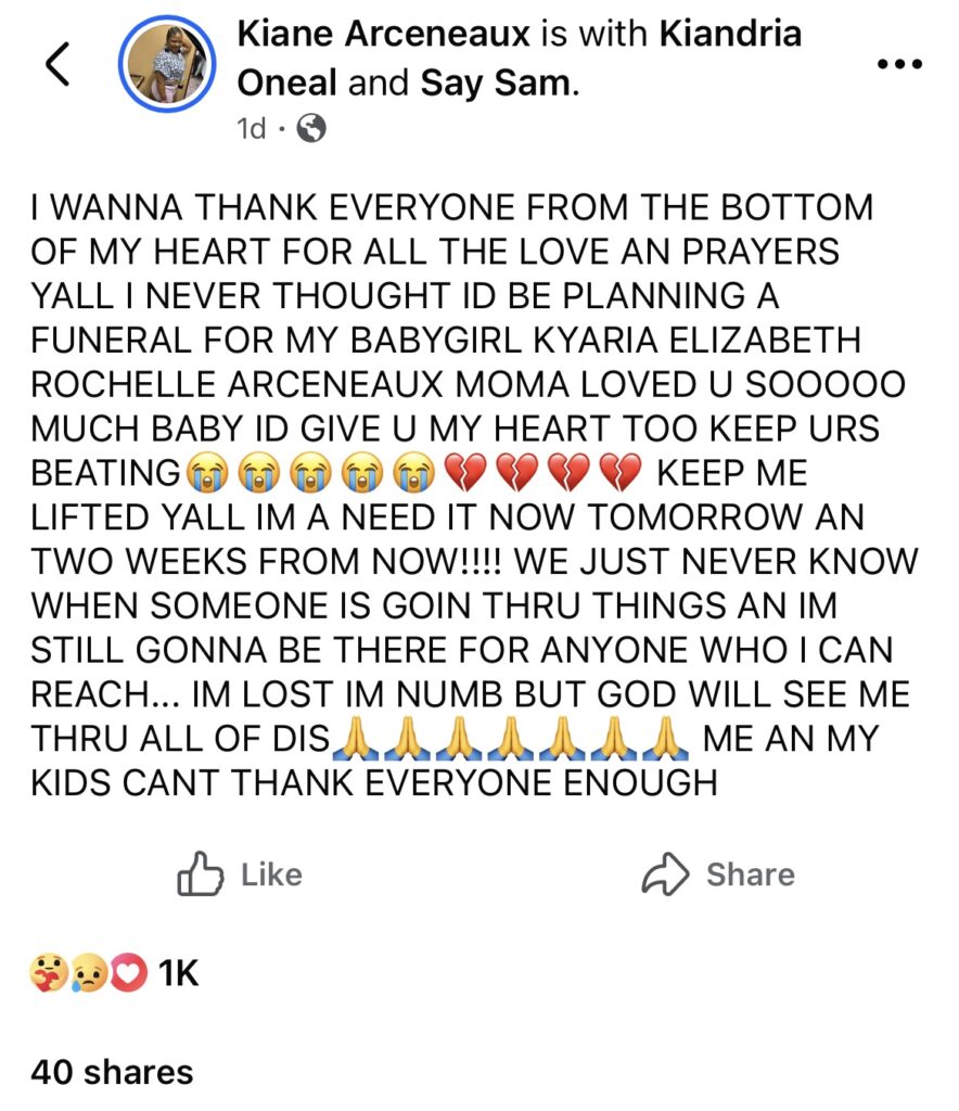 “I WANNA THANK EVERYONE FROM THE BOTTOM OF MY HEART FOR ALL THE LOVE AN PRAYERS YALL I NEVER THOUGHT ID BE PLANNING A FUNERAL FOR MY BABYGIRL KYARIA ELIZABETH ROCHELLE ARCENEAUX MOMA LOVED U SOOOOO MUCH BABY ID GIVE U MY HEART TOO KEEP URS BEATING (crying face emoji/ broken heart emoji),